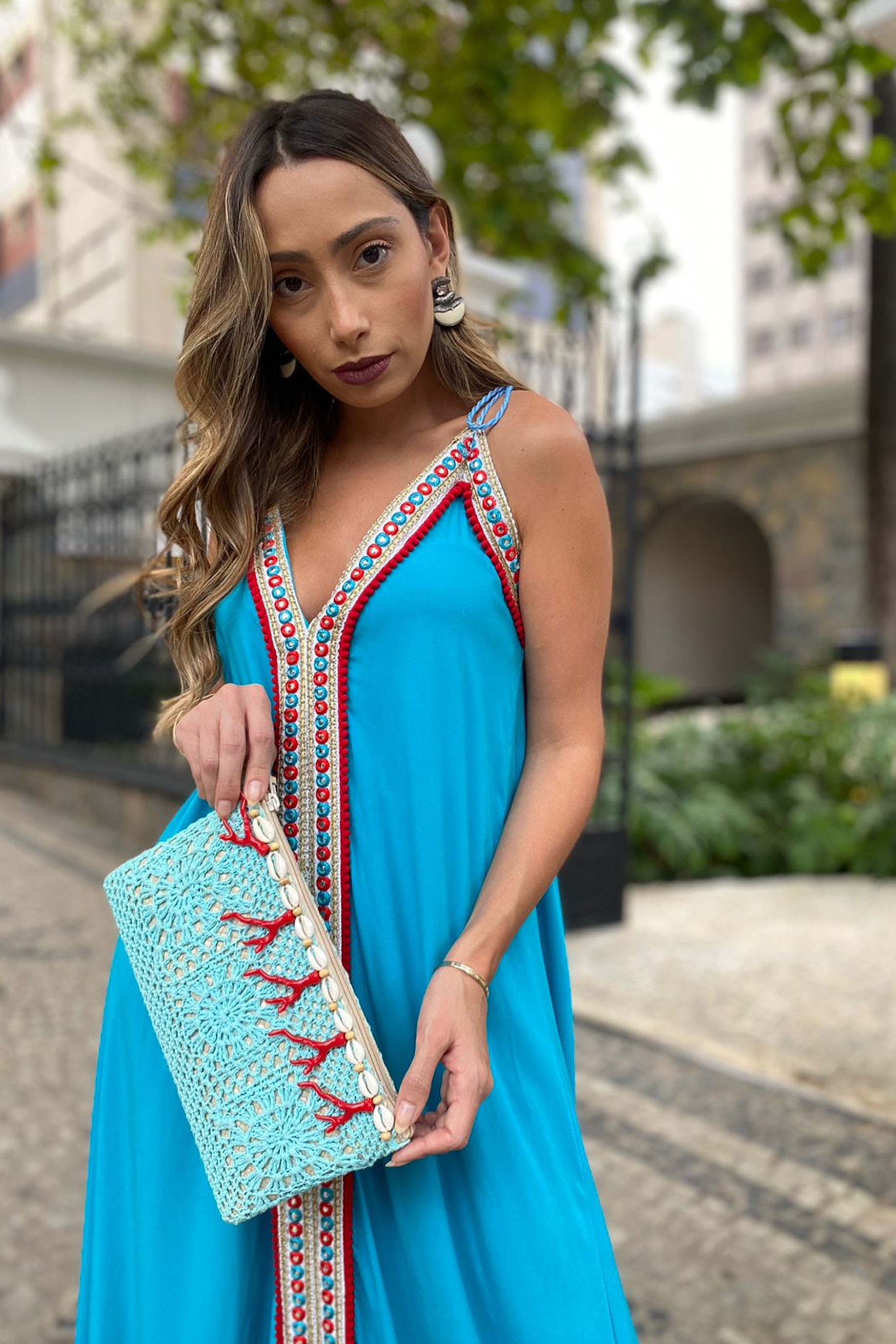 O vestido longo é uma peça leve, fluida e sofisticada, marcada pelo mix de estampas florais em diferentes fundos e tonalidades. A parte superior traz um decote em V delicado, emoldurado por um babado que valoriza o colo e acrescenta movimento. As mangas médias em estilo flare reforçam a feminilidade da peça, finalizadas com um detalhe estampado que contrasta de forma elegante. O corpo do vestido é composto por camadas diagonais que se sobrepõem, criando um efeito visual harmonioso e alongador. O fundo da parte central é adornado por flores, enquanto a barra apresenta uma estampa mais marcada, em fundo claro com flores coloridas e detalhes circulares que trazem modernidade à composição. Com caimento fluido, o vestido combina romantismo e contemporaneidade, sendo ideal para ocasiões casuais sofisticadas ou eventos ao ar livre.